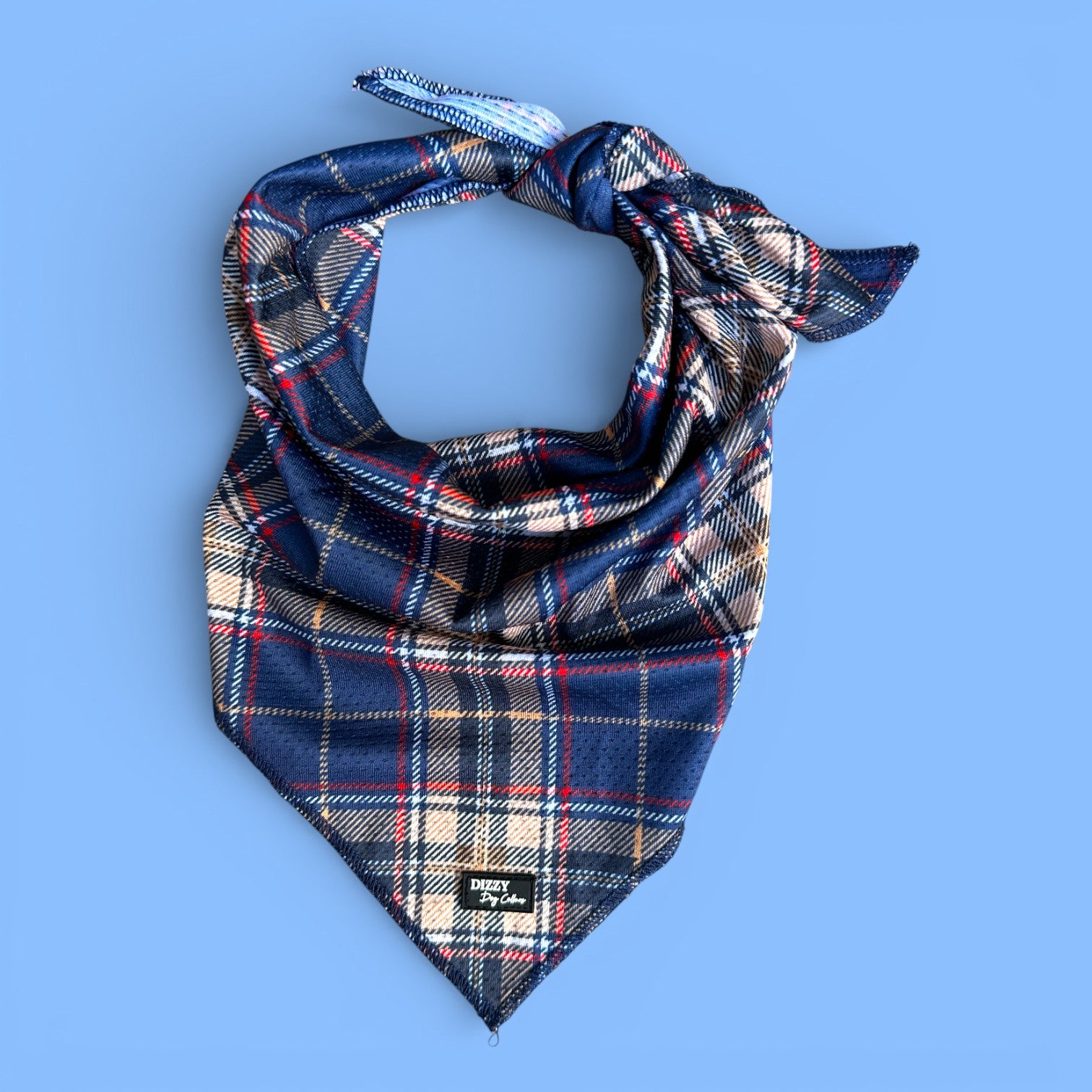 Add a touch of classic sophistication to your dog's look with the Highland Charm bandana. This timeless navy and cream plaid pattern brings traditional tartan styling to everyday adventures in an easy tie-up design.