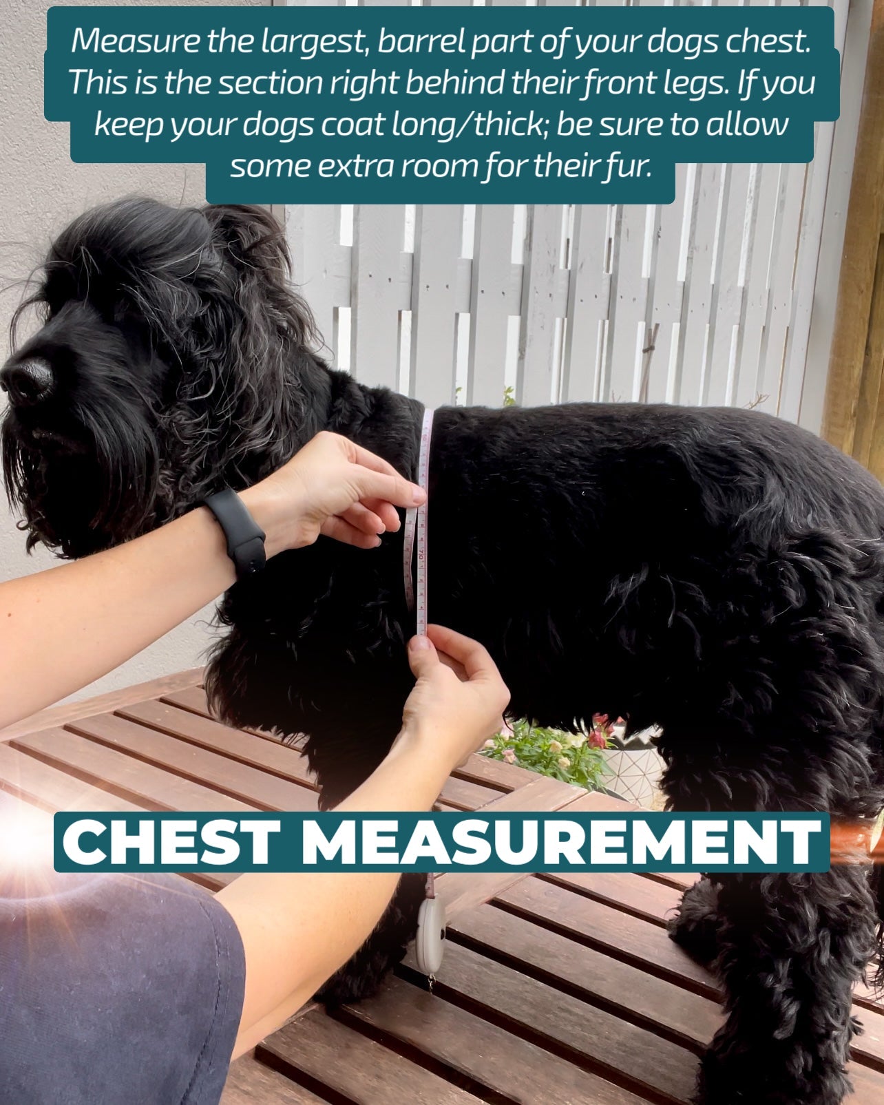 Tip: Measure snugly but comfortably – you should be able to fit two fingers between the harness and your dog.