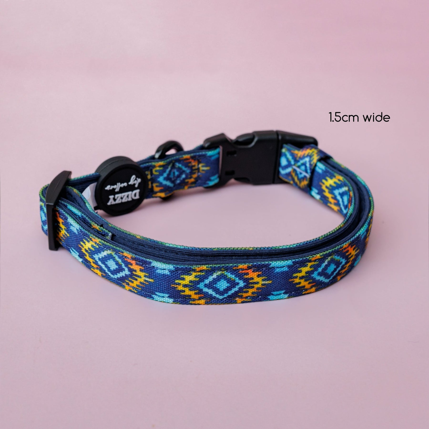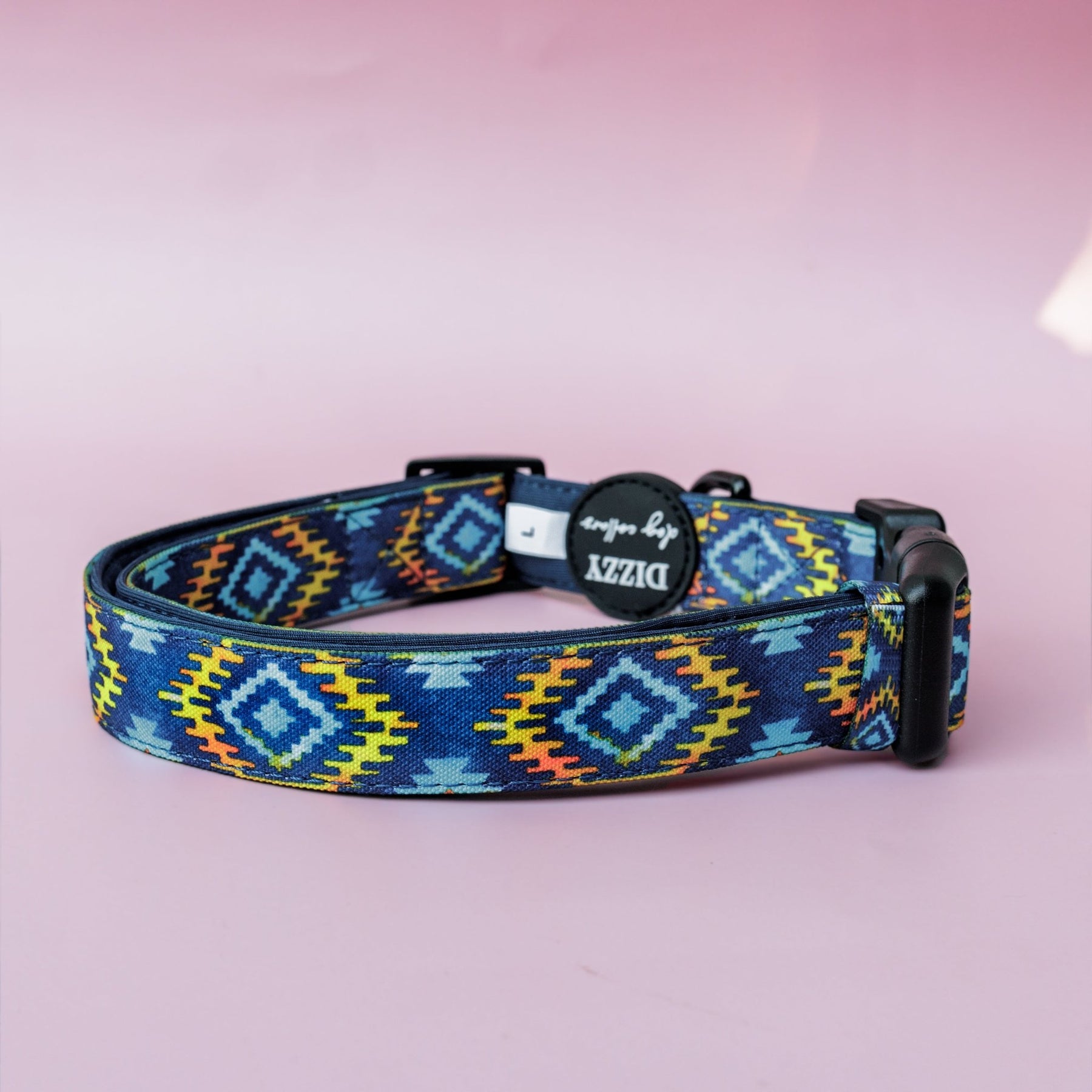 Aztec Empire Dog Collar  Description: This adjustable dog collar features a striking Aztec design in vibrant colours. Made with a combination of canvas and neoprene for comfort and durability, it includes a quick-release buckle and a sturdy D-ring for leash attachment.