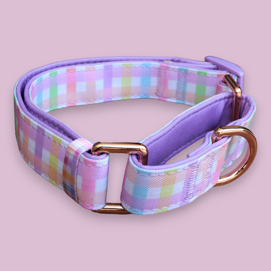 A martingale collar is made with two loops. The larger loop is slipped onto the dog's neck and a lead is then clipped to the smaller loop. When the dog tries to pull, the tension on the lead pulls the small loop taut, which makes the large loop smaller and tighter on the neck, thus preventing escape.Properly fitted, the collar will be comfortably loose whenever the dog is not pulling against the leash.