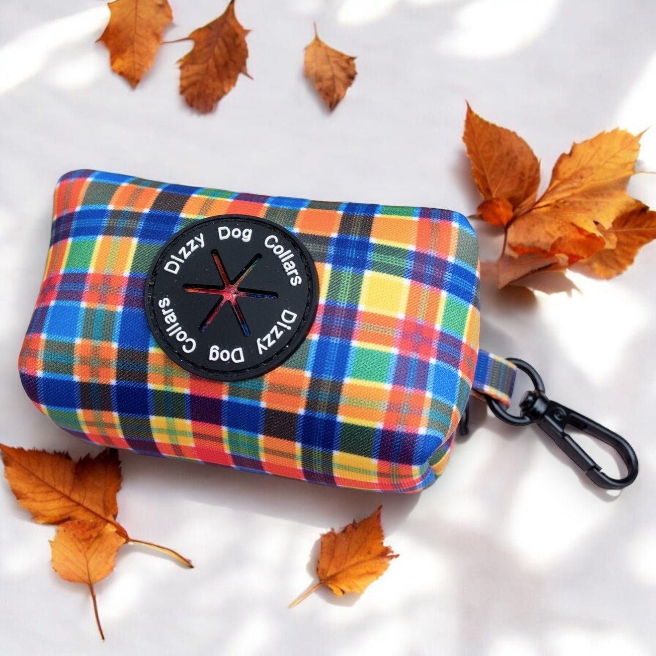 The image features a colorful plaid dog accessory bag on a light surface, accented by autumn leaves. The bag is labeled "Dizzy Dog Collars," and the professional composition highlights the bag, enhanced by the seasonal backdrop of fallen leaves.