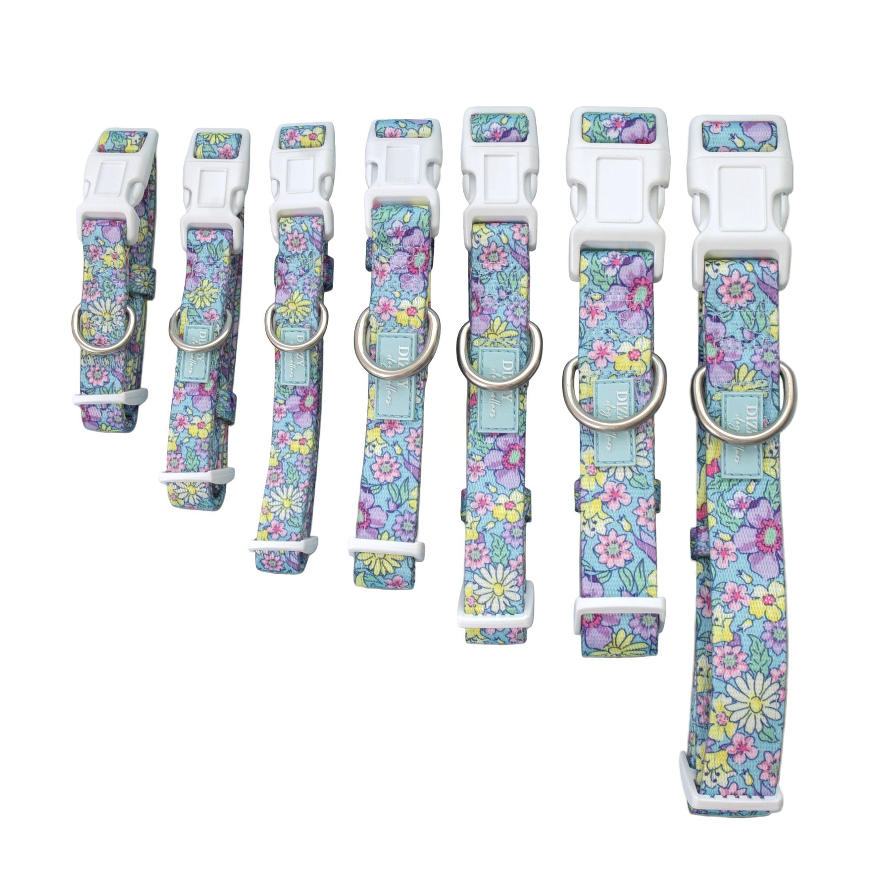 Add a touch of whimsical charm to your pup's look with the Floral Fable Dog Collar. Featuring a delicate pastel floral design in soft pinks, blues and greens, this collar brings a fresh, garden-inspired elegance to every walk.